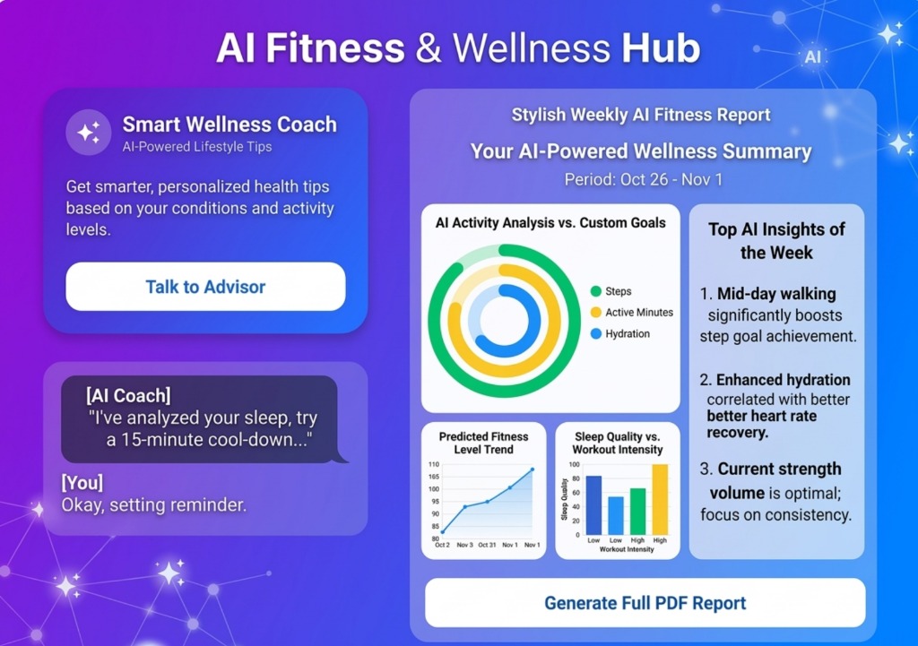 AI coaching that analyzes medical history, current mood, and activity load to generate holistic wellness plans and symptom-based precautions.