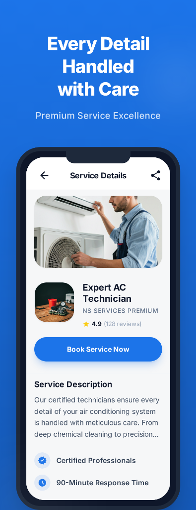 Powered by Supabase and FCM, users receive sub-second updates on booking statuses from 'Accepted' to 'Technician On The Way'.