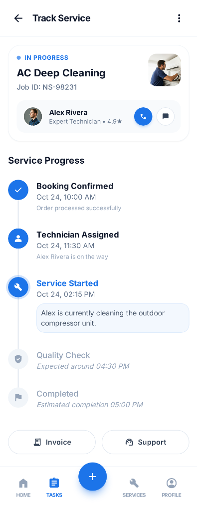 Milestone-based service progress from booking confirmation to expert quality checks.