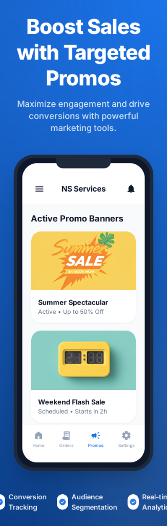 Dynamic marketing banner capability for admins to drive targeted promotions and boost service sales directly on the home screen.