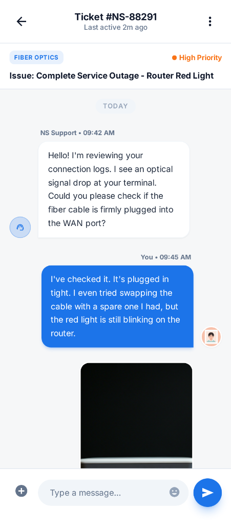 Real-time ticket management with fiber-optic signal monitoring and technician chat logs.